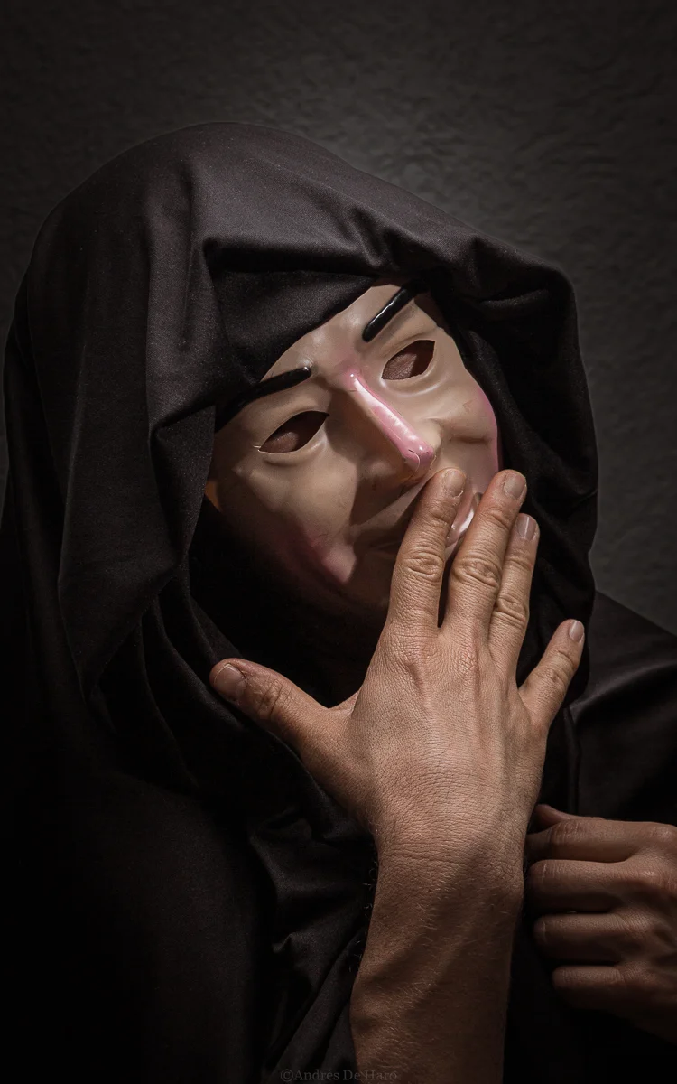En la obra de Andrés De Haro, la figura humana aparece casi desplazada, interrumpida por telas, sombras o movimiento. La identidad no importa ni se concreta en un rostro: lo esencial para él es un diálogo entre lo que somos y lo que mostramos (personajes, acaso). Andrés De Haro parece preguntarse dónde comienza la verdad del cuerpo, aunque ésta se nos escurra momentos después o se interne en un espacio pétreo, donde figuras translúcidas se mueven como apariciones evadiendo adrede proporciones y geometrías (aun considerando que el fotógrafo es matemático de formación y en su obra hay, sin duda, un velado rigor).